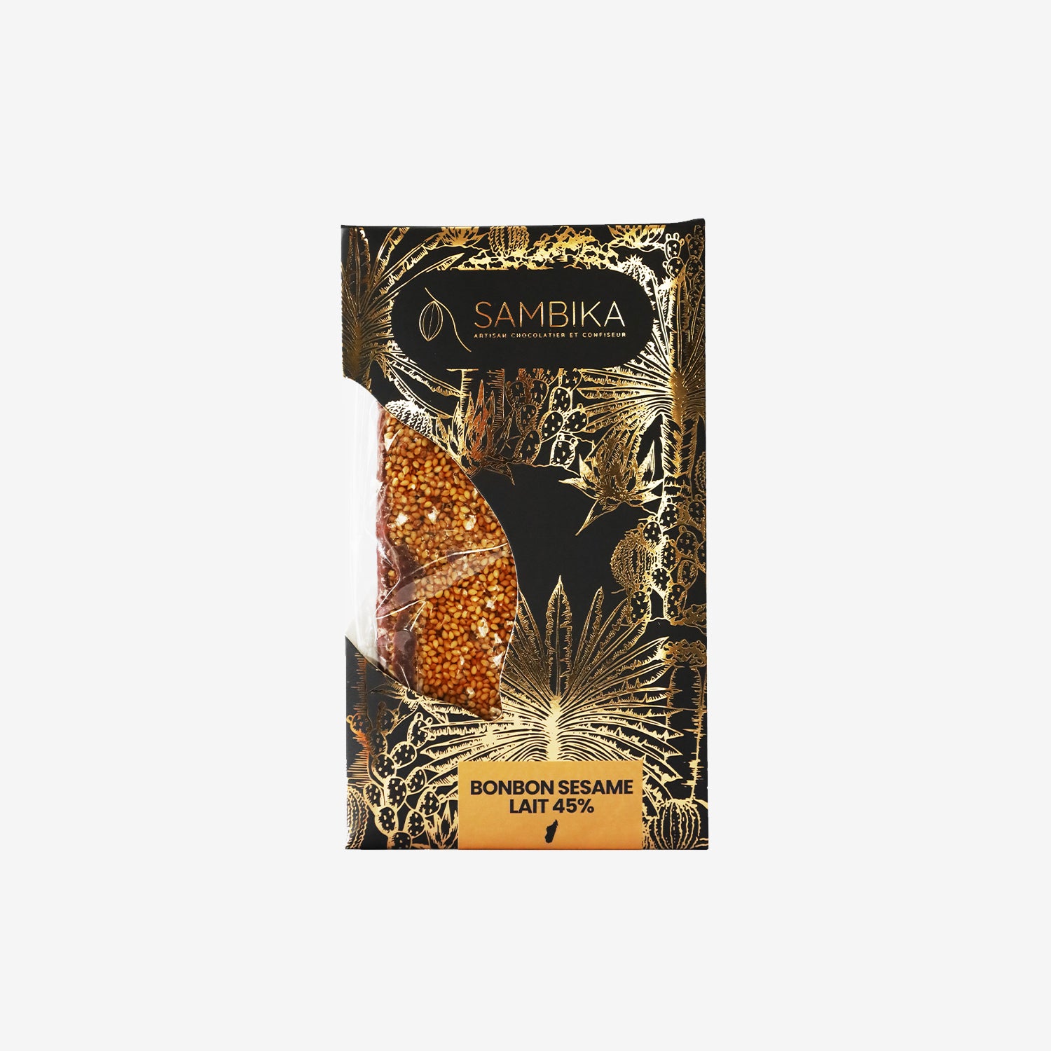 Made with toasted sesame and Madagascar's fine dark cacao, this confection offers a nutty, refined indulgence. The roasted sesame brings earthy warmth and subtle crunch, while the smooth chocolate adds velvety intensity and lasting richness.